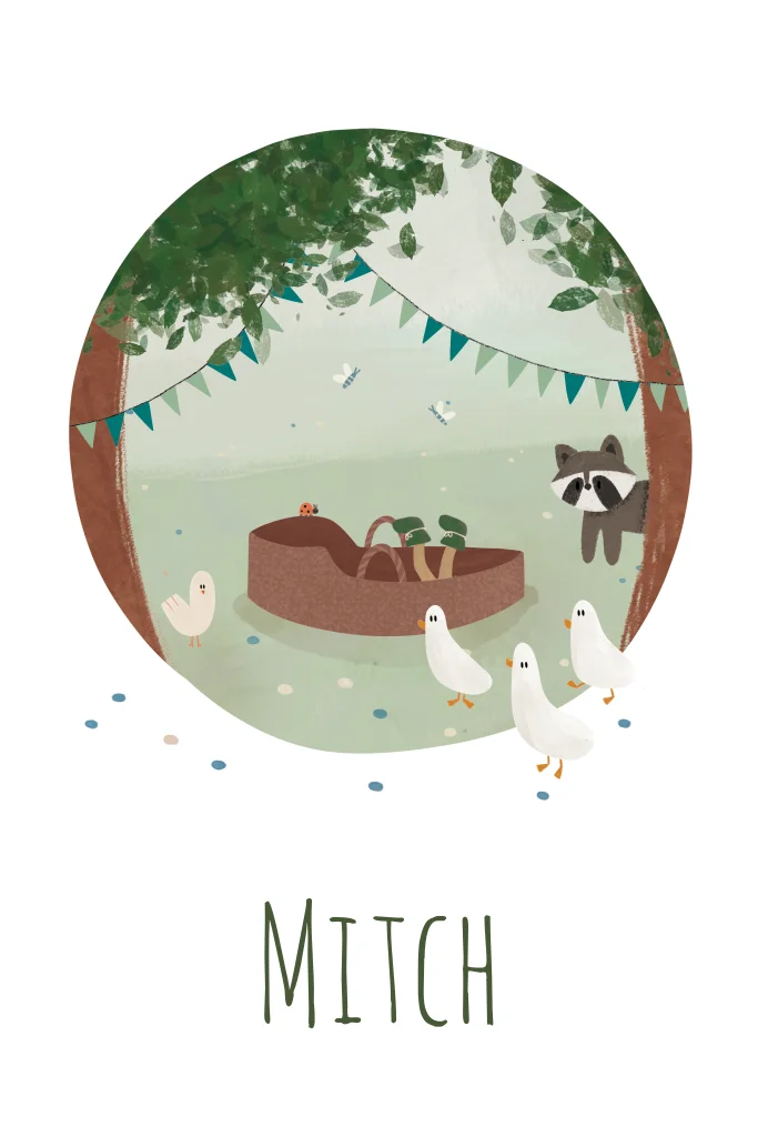 Een grappig geboortekaartje met een mozesmandje in het bos omringd door nieuwsgierige diertjes, zoals eendjes, vlindertjes en een wasbeertje.