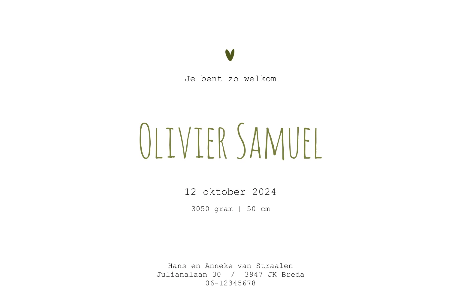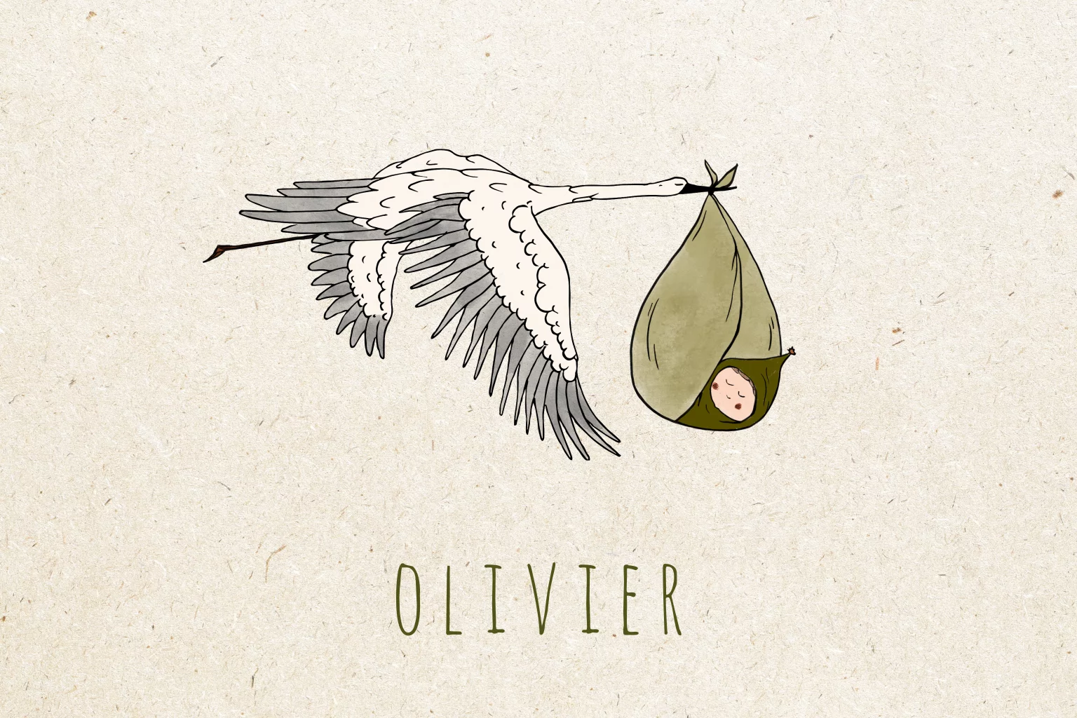 Een gevouwen geboortekaartje in recycle look met een schattige baby die gevlogen wordt door een ooievaar.