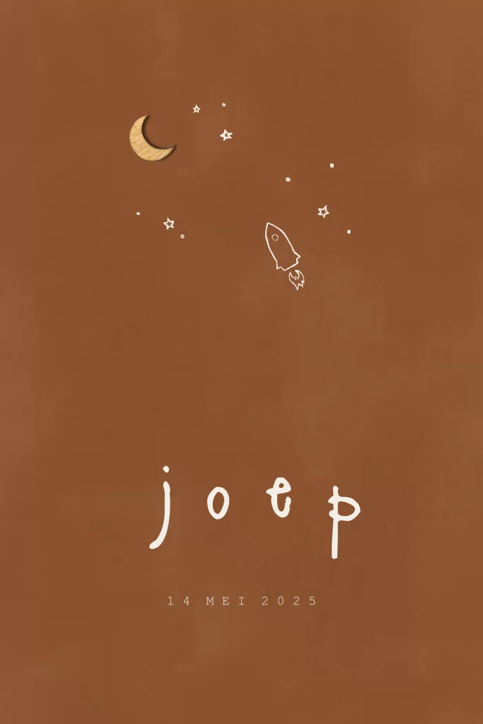 Roestbruin watercolor geboortekaartje met maan, sterren en een raket.