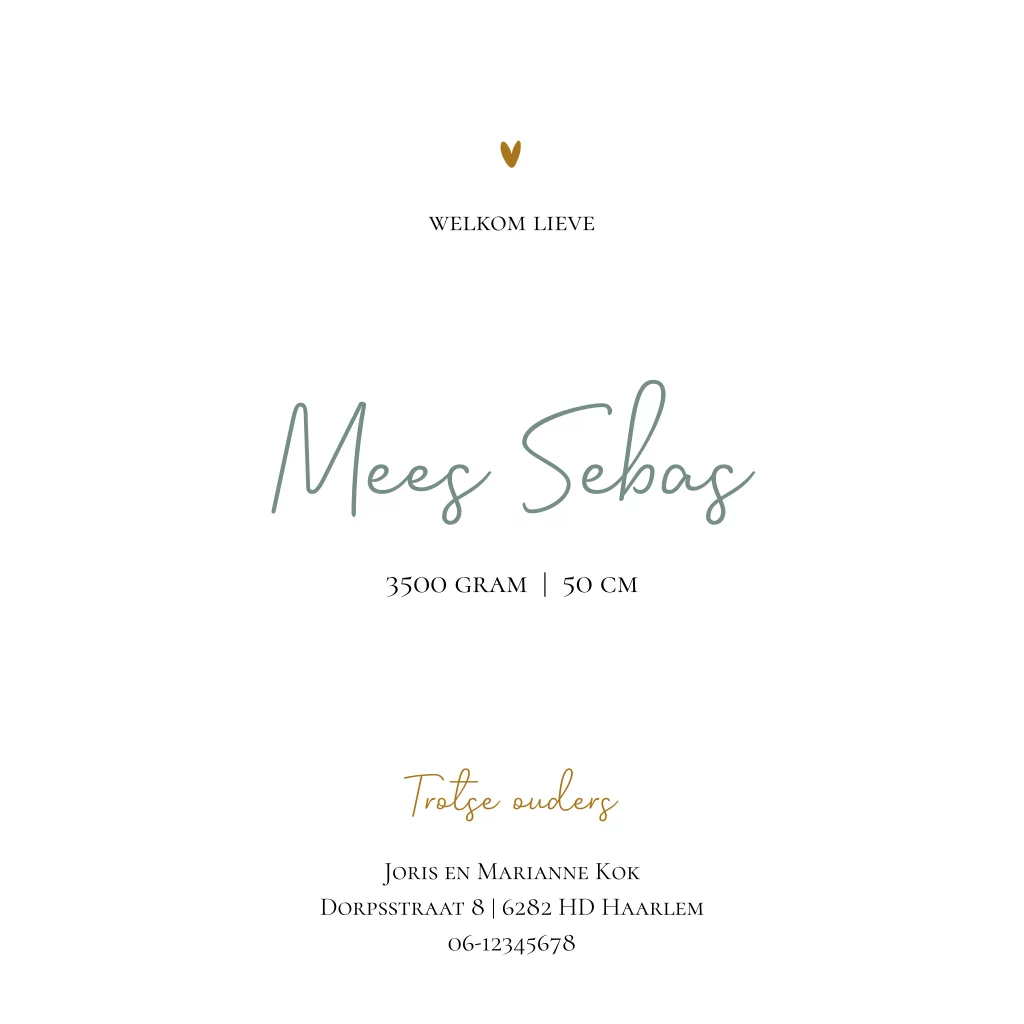 - Marloes“Ruime keuze uit geboortekaartjes die passen bij het seizoen, heel fijn dat je ze zelf kan aanpassen naar smaak. We hadden alles klaar staan en hoefde alleen nog geboorteinfo aan te passen. Daardoor waren de kaartjes al op dag 3 na de geboorte in huis! Superfijn.”