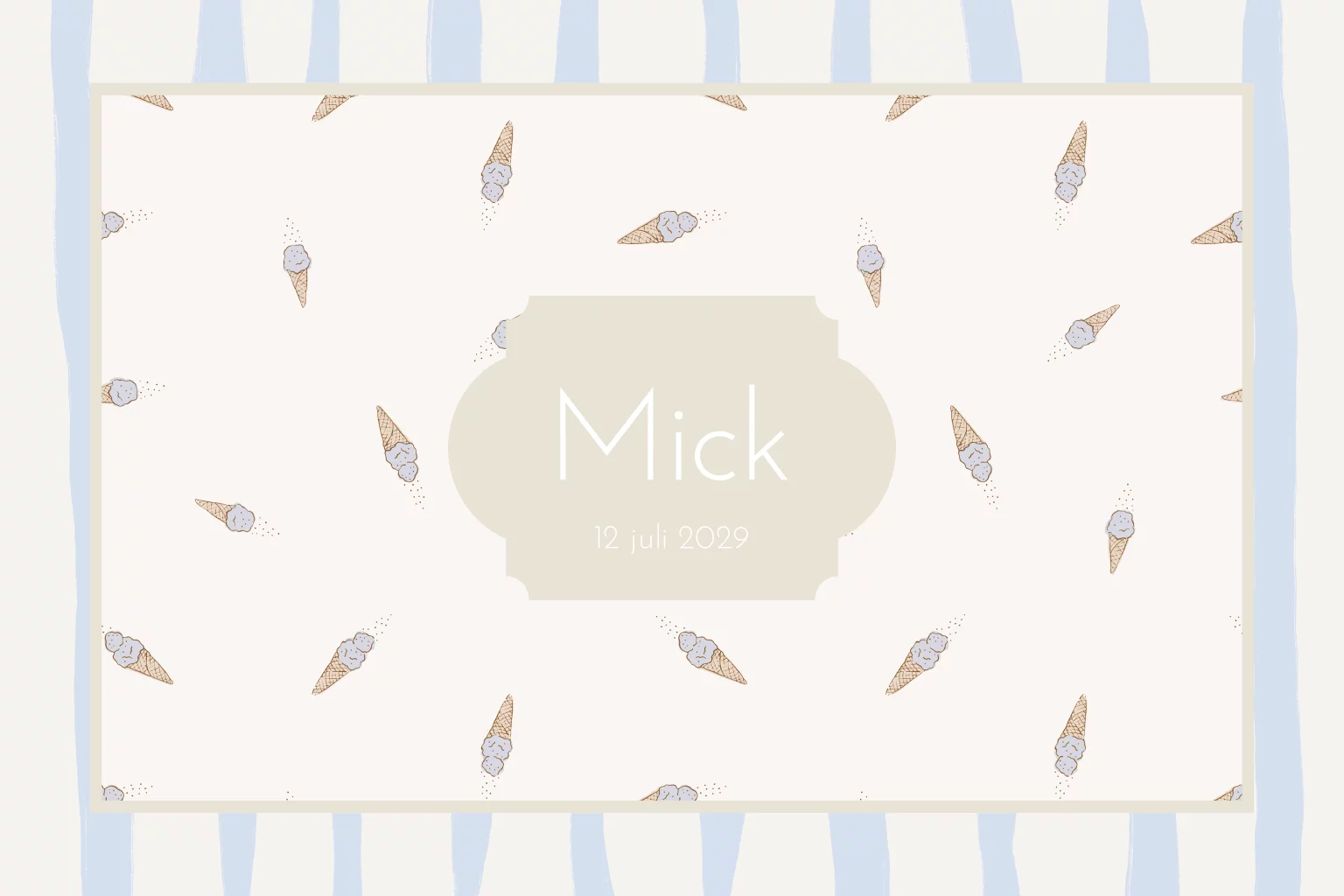 Zomers geboortekaartje voor een jongen. Met ijsjes en streepjes patroon in pasteltinten blauw en zandkleur.