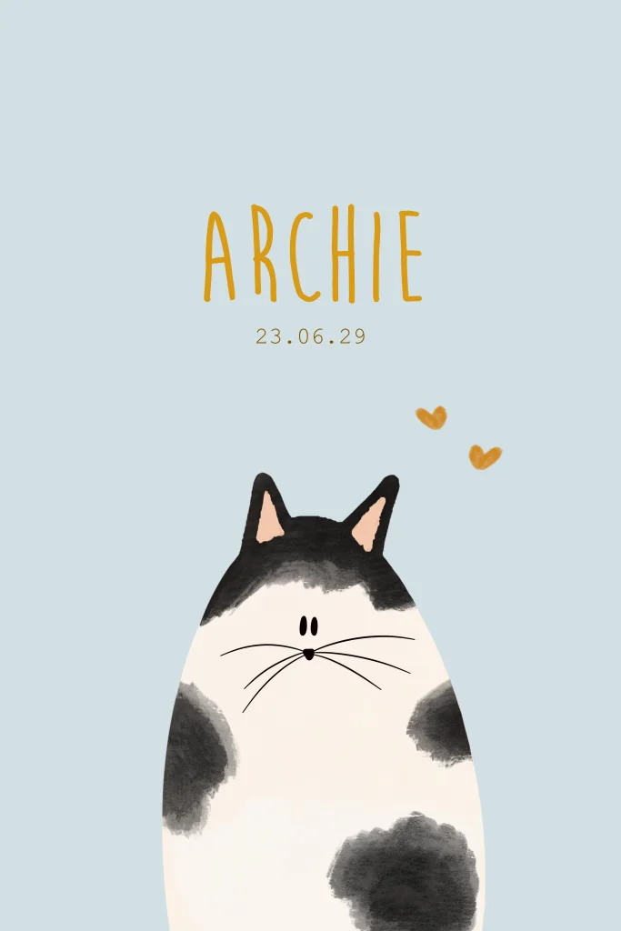 Geboortekaartje voor een jongen met een zwart / witte kat. De illustratie is op een grappige manier getekend. Graag jouw hond of kat op dit geboortekaartje? Mail ons voor hulp bij het ontwerp!