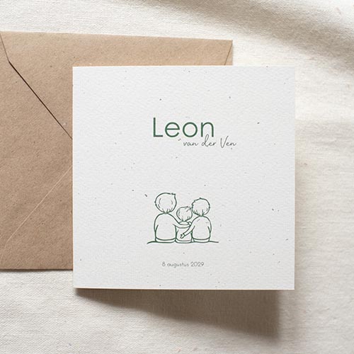 Lief en klassiek geboortekaartje voor een jongen. Met een lijntekening van 3 broertjes.
