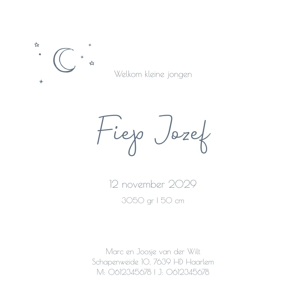 Klassiek geboortekaartje met streepjes. De maan en sterretjes en de naam op de voorzijde staan in goudfolie.
