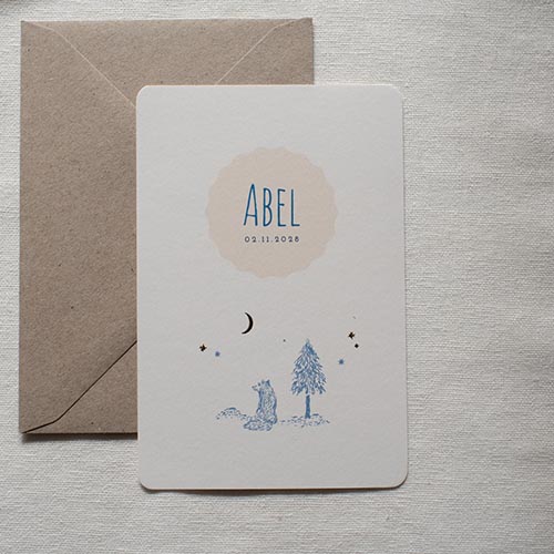 Geboortekaartje voor een jongen. Met een een vos in lijntekening, kijkend naar de maan en sterren.