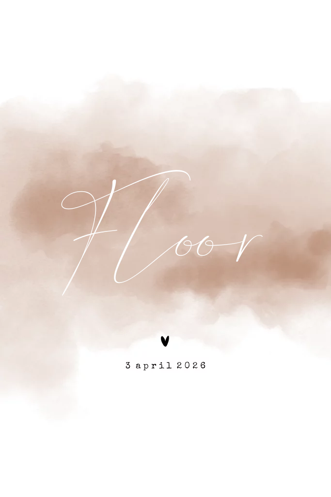 Geboortekaartje met roodbruine watercolor achtergrond. De naam op de voorzijde staat in zilverfolie. Deze pas je makkelijk aan in een andere foliekleur!
