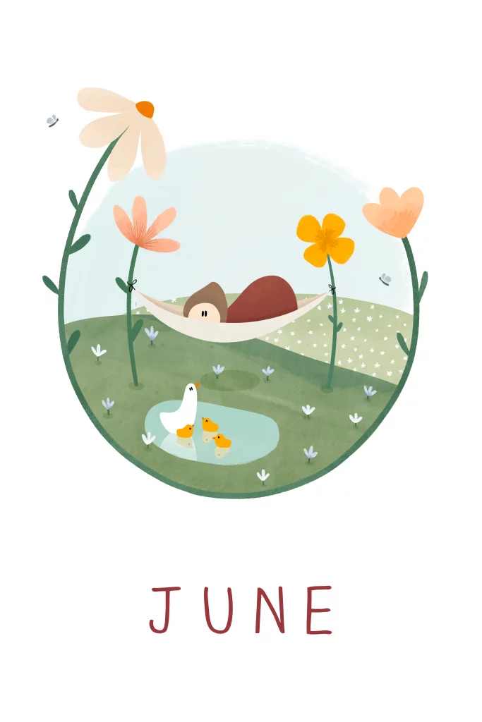 Een grappig geboortekaartje met een klein baby meisje in een hangmat. Tussen de bloemen met een nieuwsgierige eend en kuikentjes.