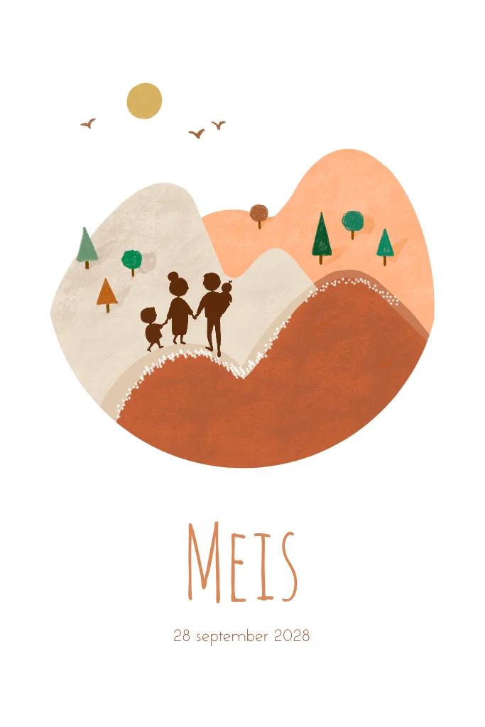 Geboortekaartje met een papa, mama, grote broer en baby zusje. Bij dit kaartje pas je gemakkelijk de kleuren van de bergen, de poppetjes en de bomen aan via de kleuren in de editor. Ook pas je de gezinssamenstelling makkelijk aan door de juiste poppetjes en ook huisdieren bij elkaar te zetten. Je vindt deze bij de afbeeldingen onder 'Bergen silhouetten'.