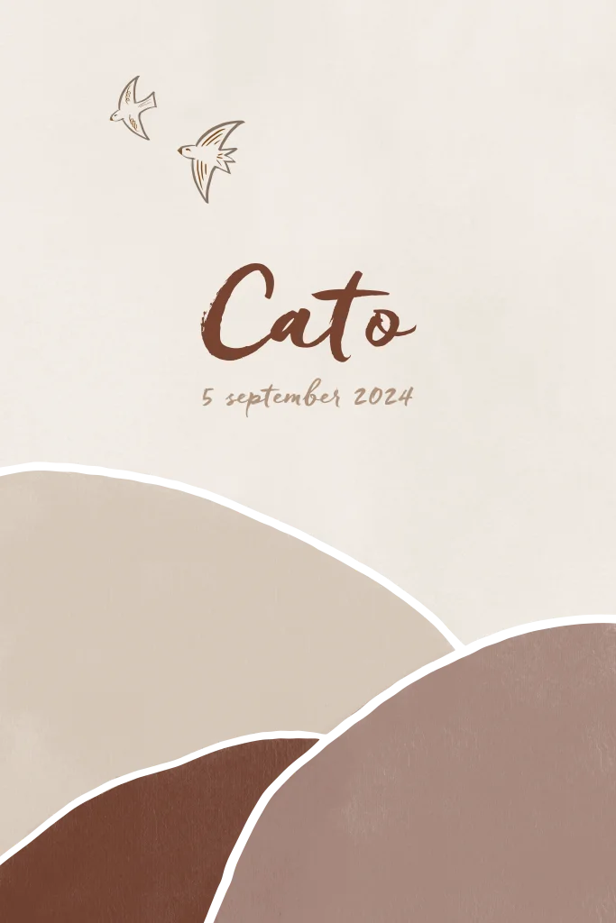Geboortekaartje met bergen en lieve vogeltjes in aardetinten. Het kaartje heeft goudfolie lijnen over de bergen voor een extra gaaf effect.