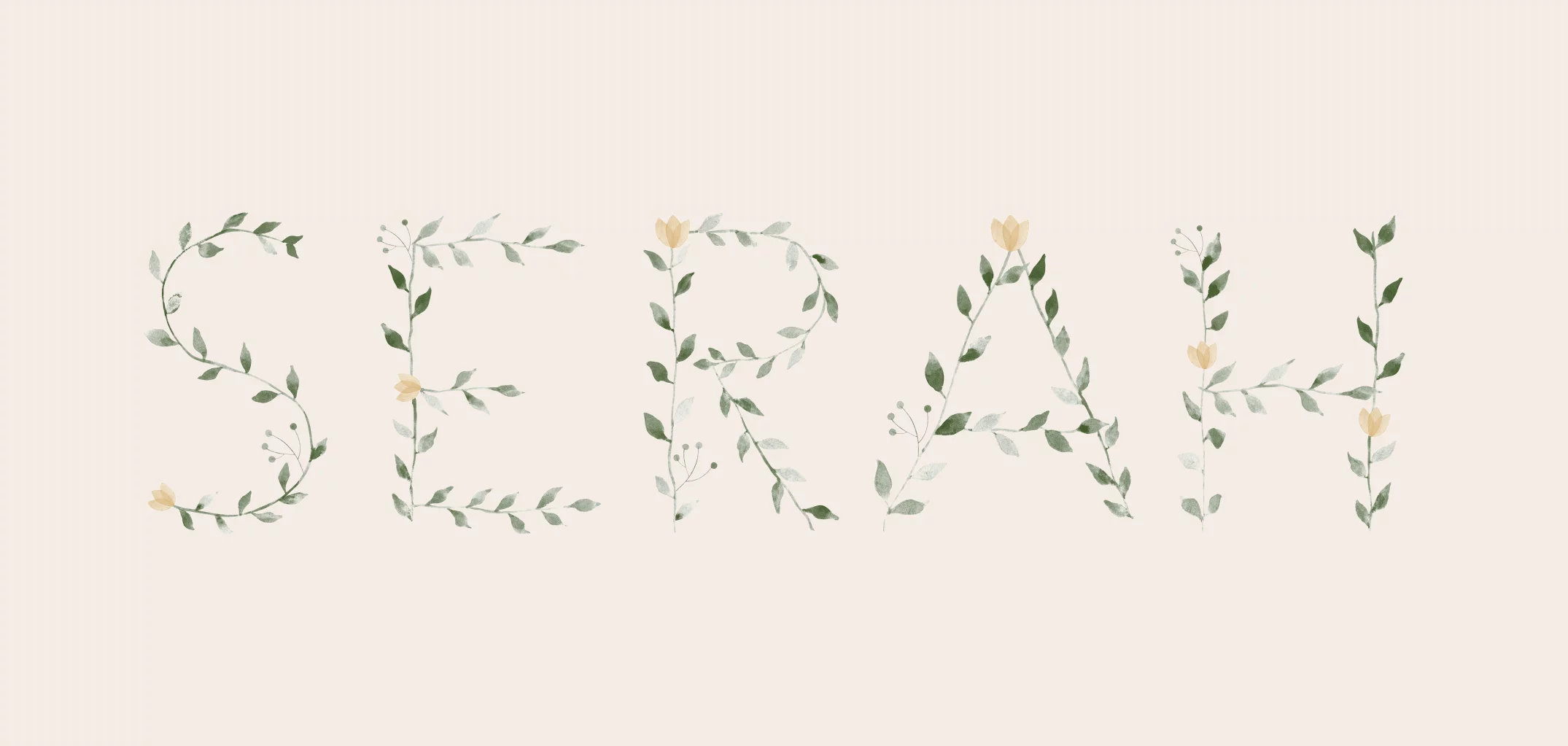 Geboortekaartje met naam in een bladerkrans met lieve bloemetjes. Stel de naam van jouw kindje samen met de letters die je vindt onder Alfabet bij de Afbeeldingen.