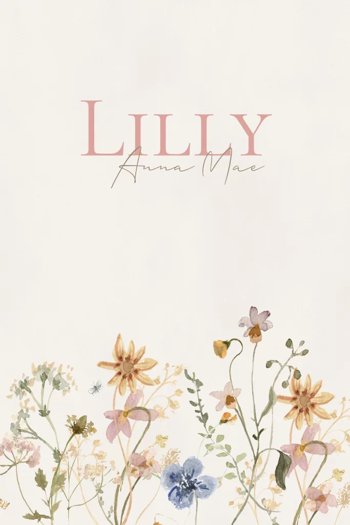 Een schattig geboortekaartje met een bloemenveld in vrolijke pasteltinten.