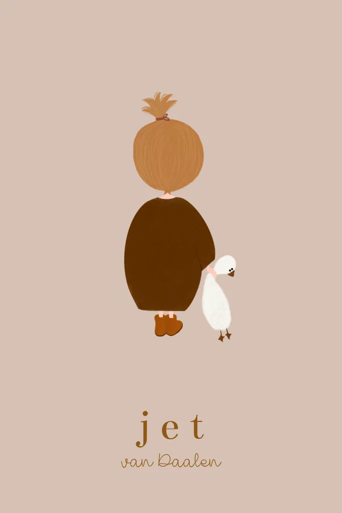 Een minimalistisch geboortekaartje met een klein meisje met een knuffel gans in haar hand. Kindjes met een andere haarkleur en haarsoort vind je bij de afbeeldingen onder 'kindjes'. Staat jouw kindje er niet tussen? Mail ons dan voor een aanpassing op maat!