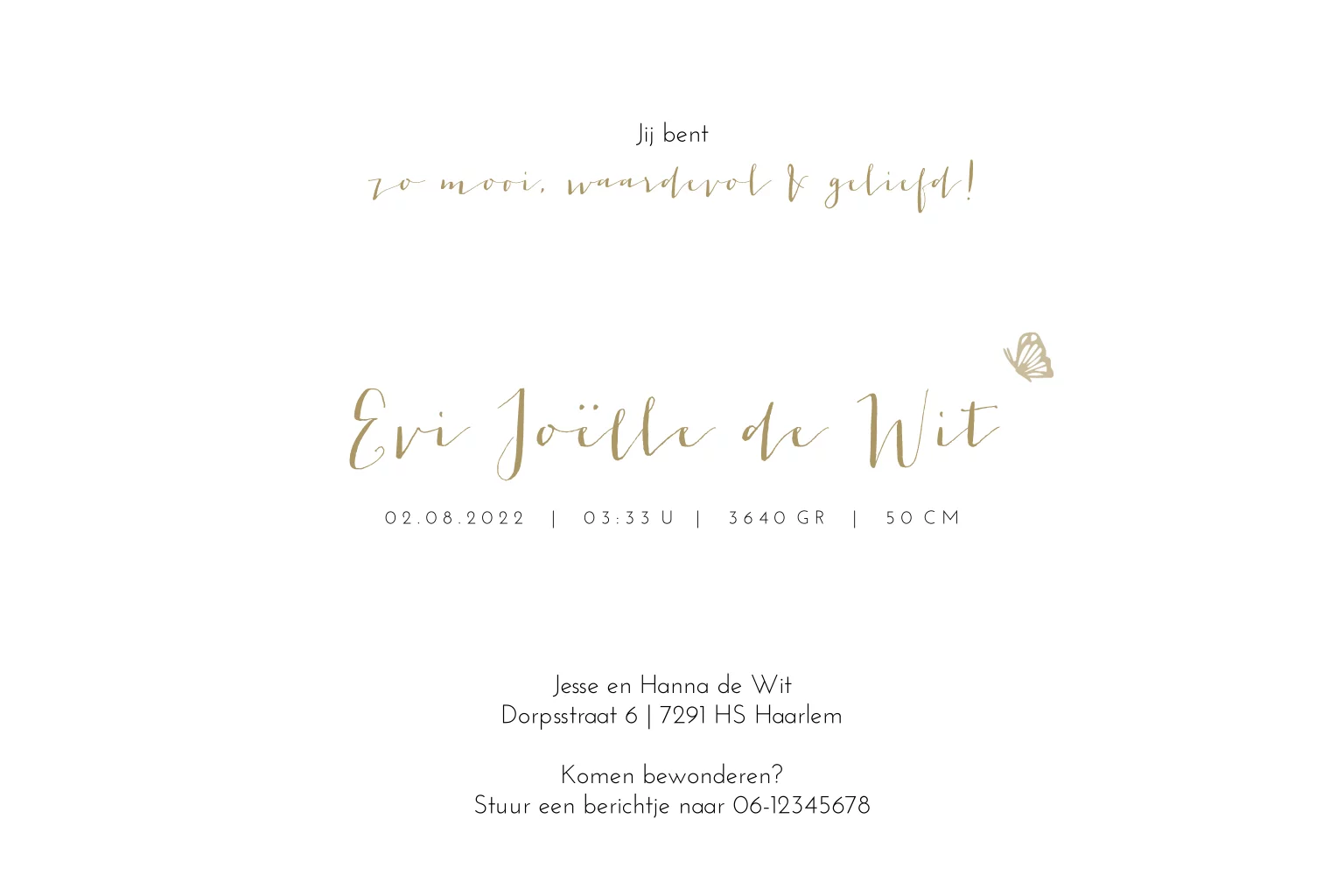 - Marloes“Ruime keuze uit geboortekaartjes die passen bij het seizoen, heel fijn dat je ze zelf kan aanpassen naar smaak. We hadden alles klaar staan en hoefde alleen nog geboorteinfo aan te passen. Daardoor waren de kaartjes al op dag 3 na de geboorte in huis! Superfijn.”