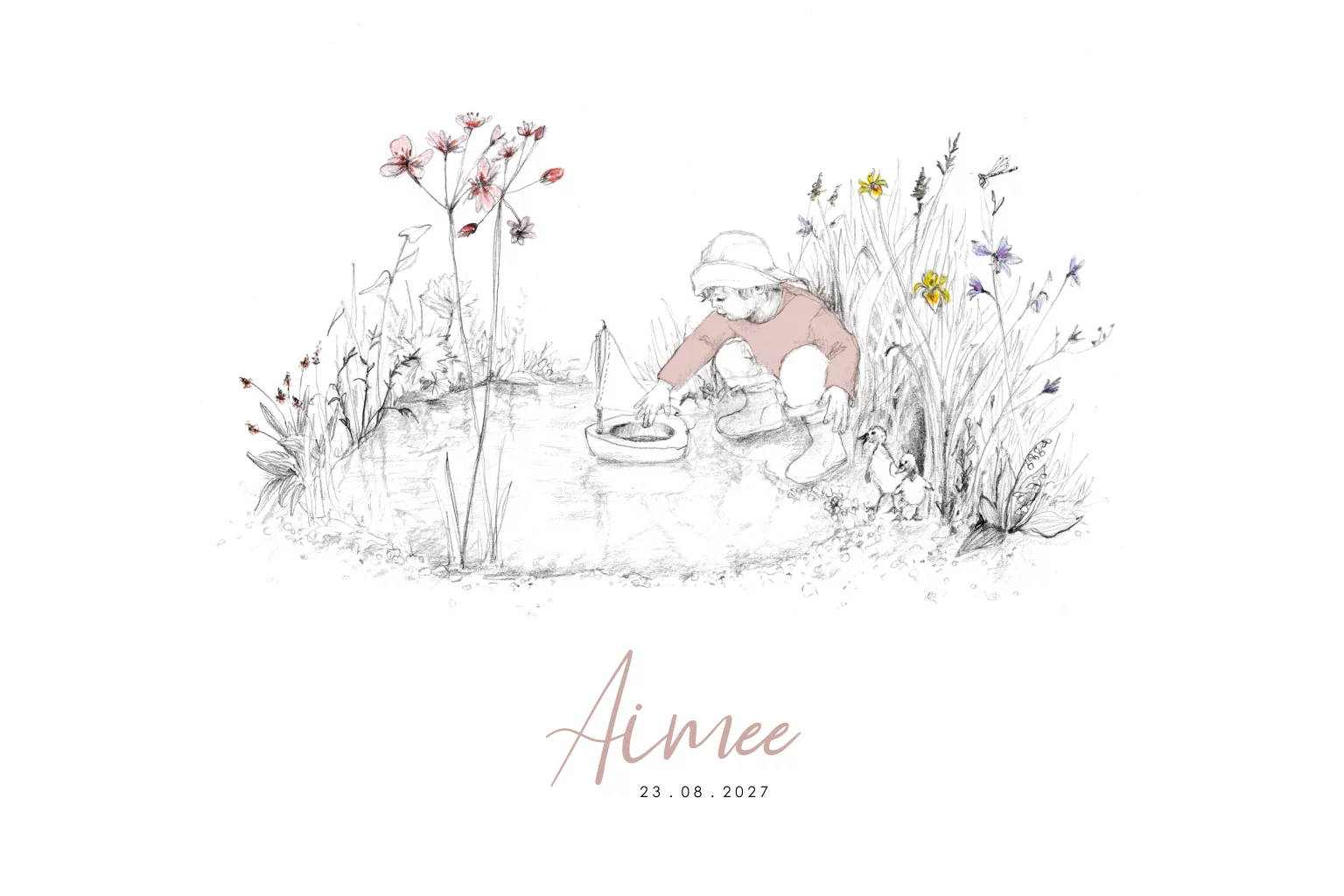 Een lief geboortekaartje met dromerige potlood illustratie van een klein meisje bij een vijvertje. Spelend met een bootje en vergezeld door 2 lieve eendjes die meekijken. Deze fantasie illustratie komt uit de speciale Studio Dijs x Een Allegaartje collectie.