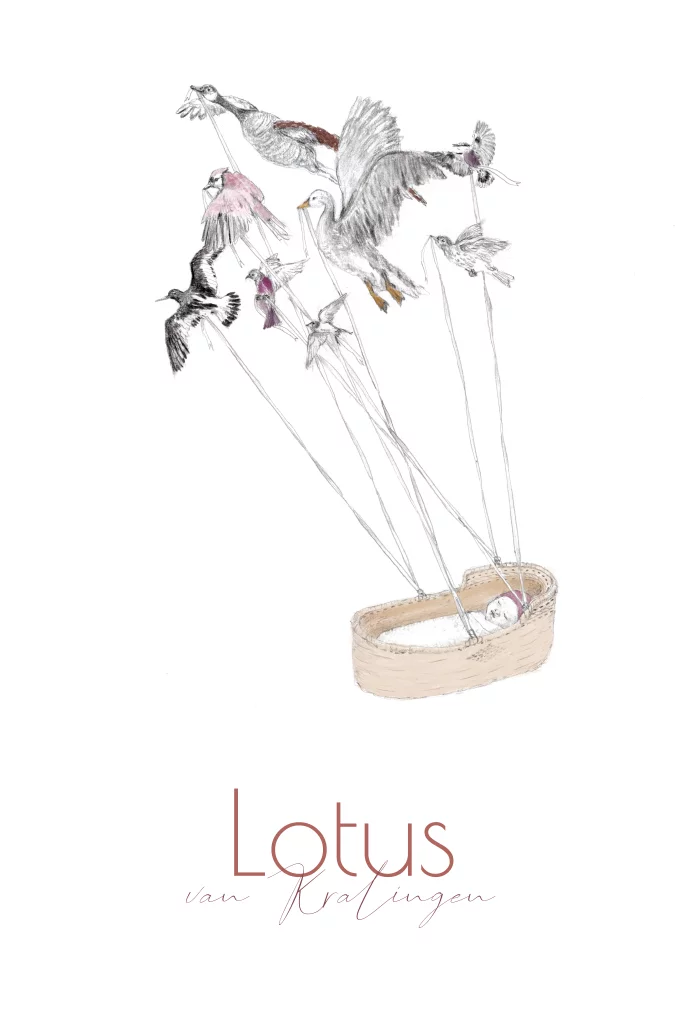Geboortekaartje met een prachtige schets potlood illustratie van een lief kindje in een mozes mandje. Door de lucht getrokken door prachtige vogels. Een sprookjesachtige illustratie uit de collectie Studio Dijs X Een Allegaartje.