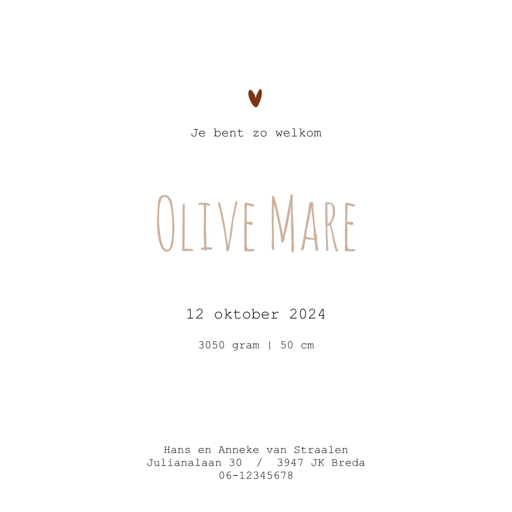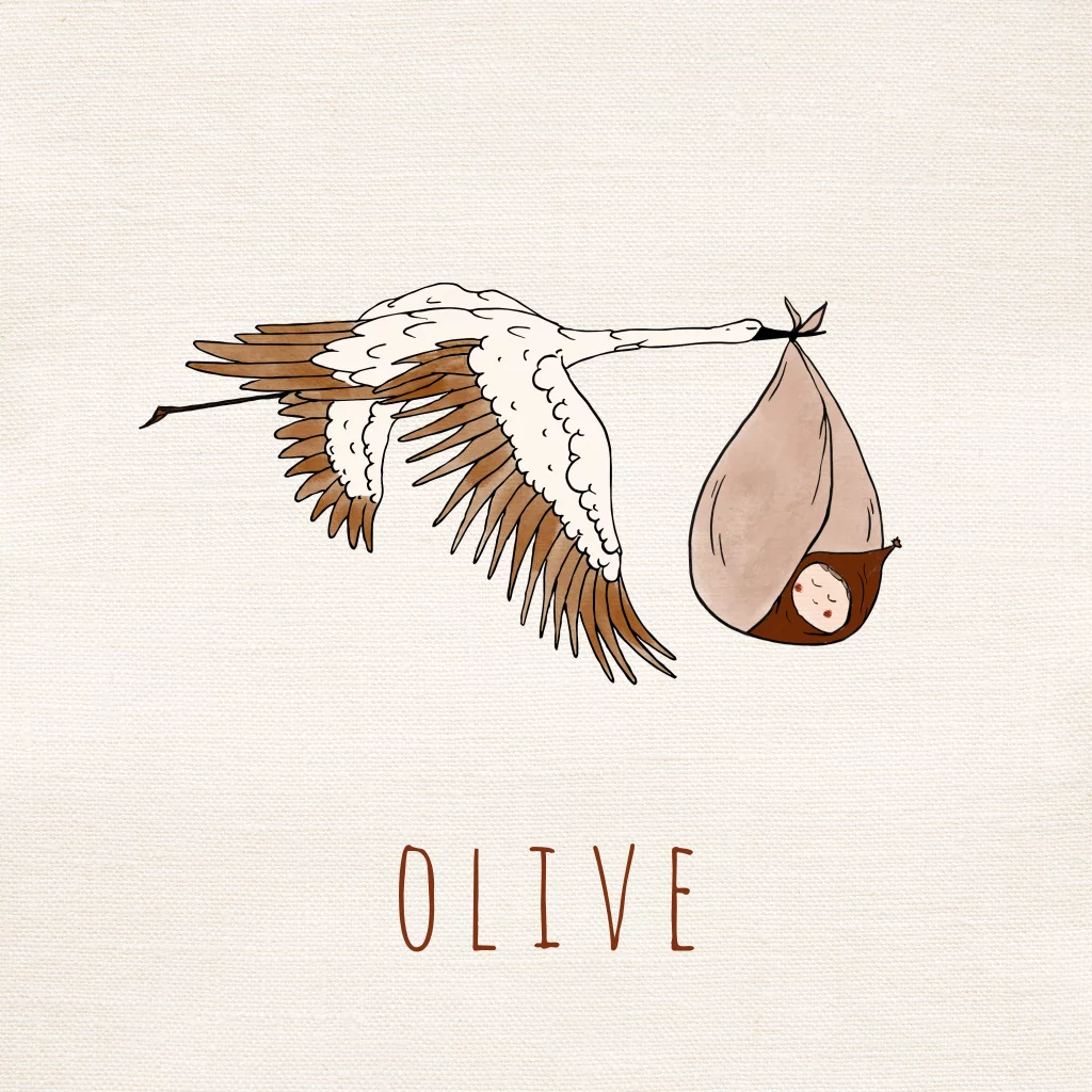 Lief geboortekaartje met een illustratie van een vliegende ooievaar met een klein meisje in zijn snavel. De achtergrond heeft een zachte linnen look.