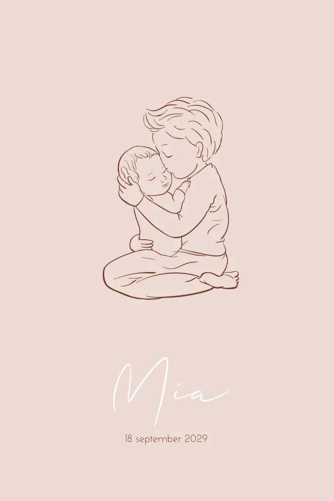 Lief geboortekaartje voor een meisje. Grote broer zit op zijn knietjes en heeft zijn kleine zusje in zijn armen. Een klein kusje op het voorhoofd. Een zoete lijntekening voor kleine zusjes.