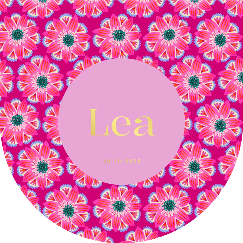 Geboortekaartje met een vrolijk en kleurrijk design bestaande uit vrolijke bloemen in de kleuren roze en groen.