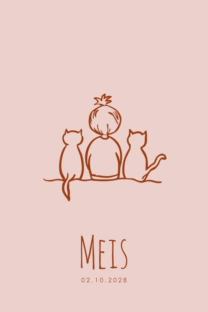 Geboortekaartje met een lijntekening van een klein meisje met haar 2 poesjes. Verander de kleur van de lijntekening, tekst en achtergrond eenvoudig in de online editor.