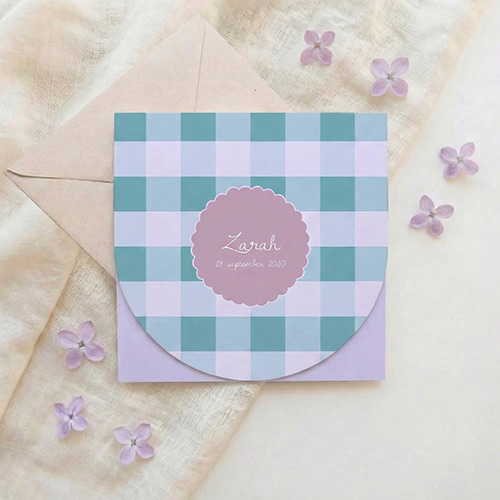 Dankzij de afgeronde voorkant en het zichtbare randje van de binnenzijde krijgt dit geboortekaartje een bijzonder detail. Het ruitpatroon in combinatie met het zachte label maakt dit ontwerp stijlvol, lief en net even anders dan een standaard geboortekaartje.