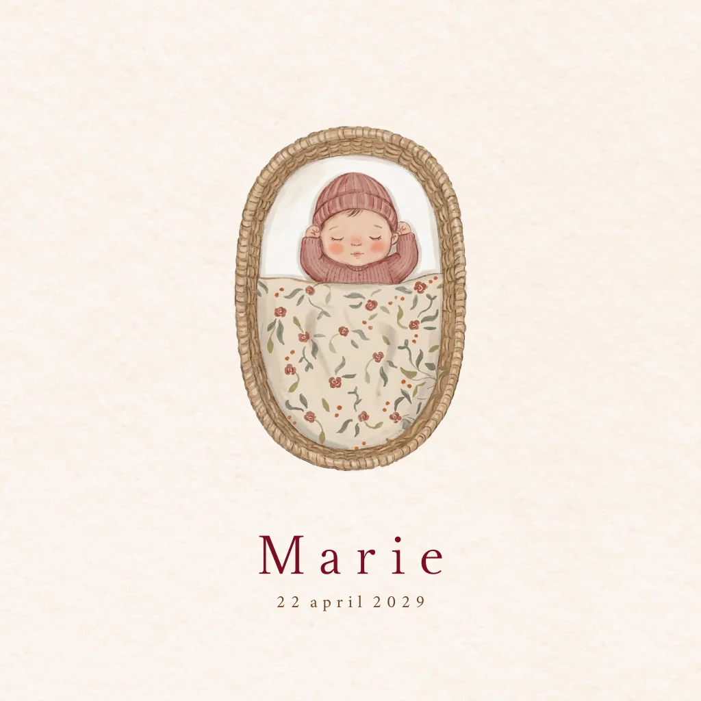 Lief geboortekaartje voor een meisje. Met een kleine baby in een mozesmandje.