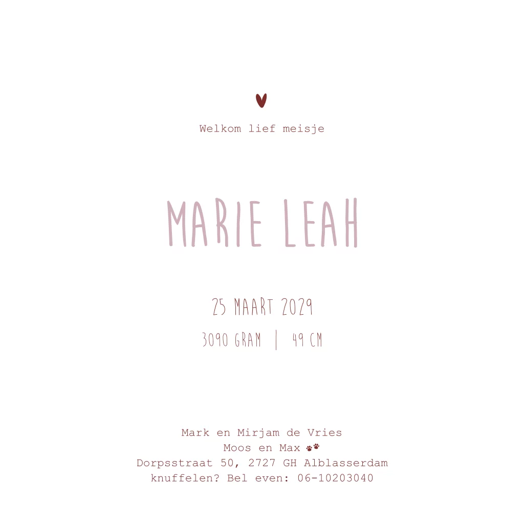 Een grappig geboortekaartje met een meisje op een bakfiets. In de bakfiets zitten haar huisdieren, een poes en een hond. Heb jij andere huisdieren? Mail ons voor een aangepast ontwerp.