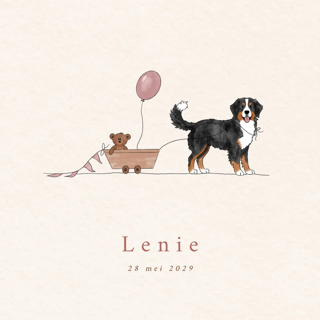 Een origineel geboortekaartje voor een meisje met een Berner Sennen hond. Met daarachter een bolderkar met knuffelbeer en ballon.