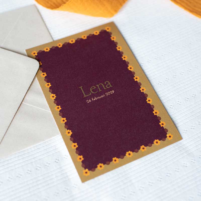 Een lief en warm geboortekaartje voor een meisje. Met warme kleuren aubergine en groen in combinatie met vrolijke bloemetjes. De naam op de voorzijde staat in goudfolie.