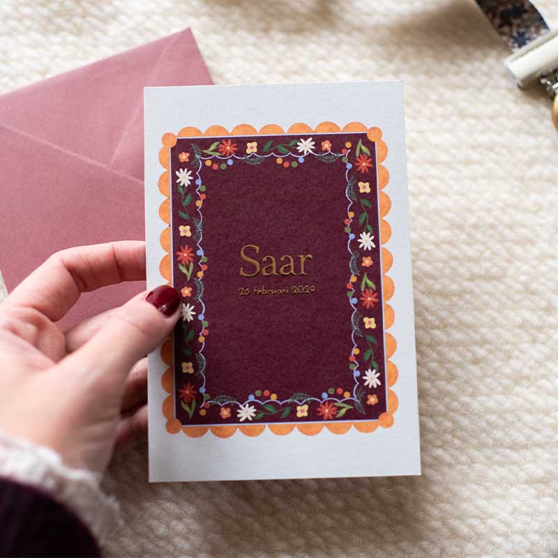 - Marloes“Ruime keuze uit geboortekaartjes die passen bij het seizoen, heel fijn dat je ze zelf kan aanpassen naar smaak. We hadden alles klaar staan en hoefde alleen nog geboorteinfo aan te passen. Daardoor waren de kaartjes al op dag 3 na de geboorte in huis! Superfijn.”