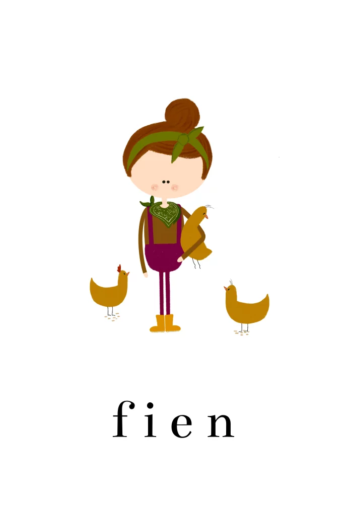 Een grappig geboortekaartje van een boerenmeisje met haar kippetjes.