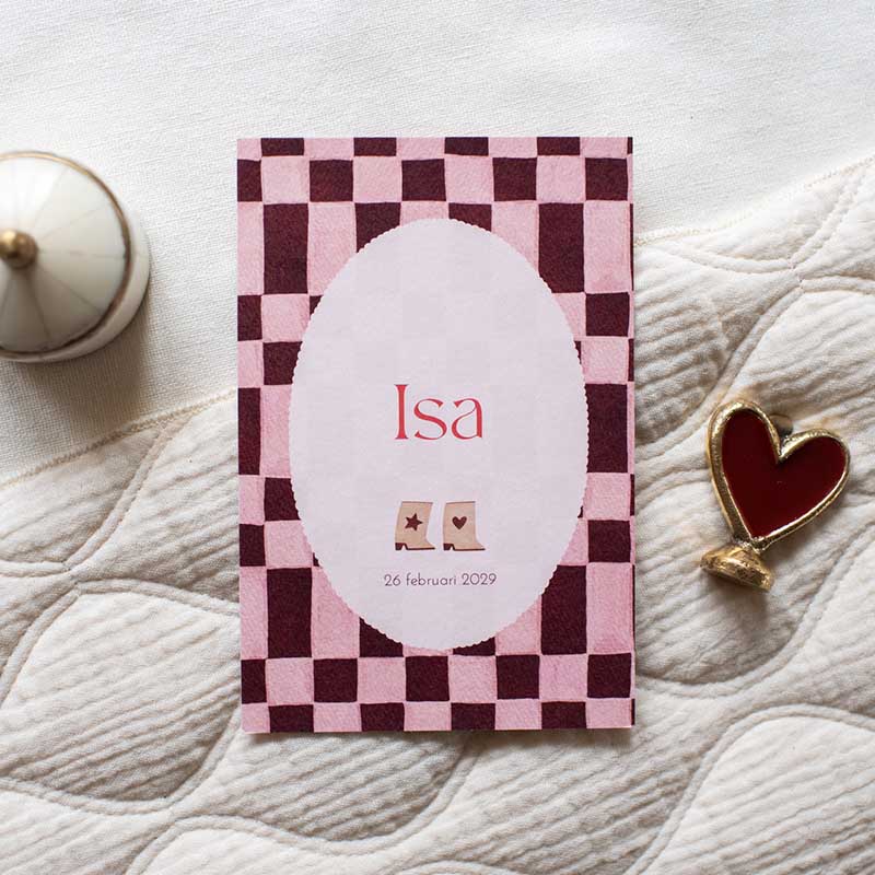 Hip geboortekaartje voor een meisje in boho eclectische stijl. Met roze en paars/rood geblokt patroon. Op de voorzijde staan 2 stoere cowboyslaarsjes.