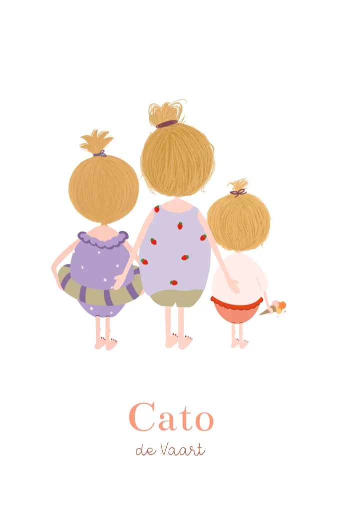 Een zomers geboortekaartje voor een meisje. Met drie zusjes die gereed zijn voor een dagje strand. Compleet met zwembandje en druipend ijsje.