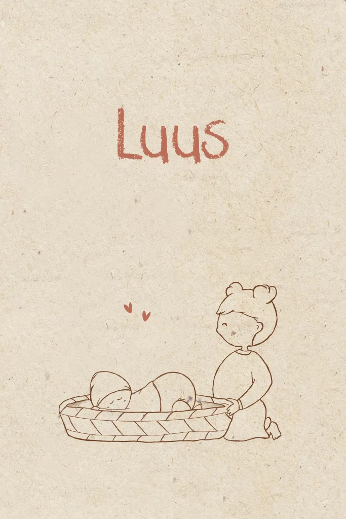 Een minimalistisch geboortekaartje voor een meisje met een fijne eco look structuur achtergrond. Met een illustratie van een lieve een baby in een mozesmandje met een trotse grote zus erbij.