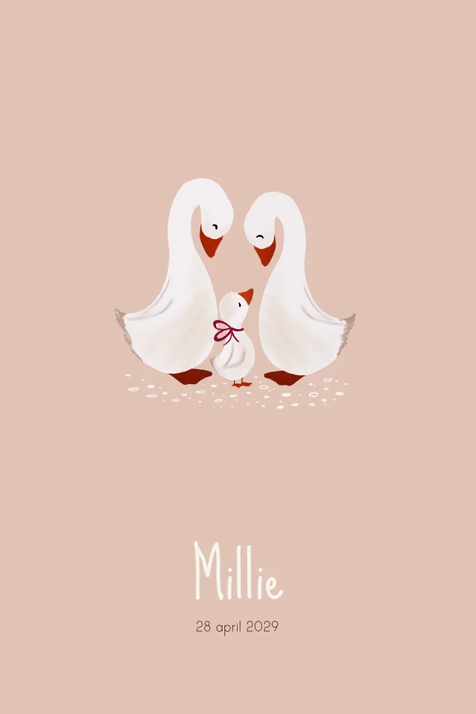 Een lief en schattig geboortekaartje met een baby gans kijkend naar zijn papa en mama.