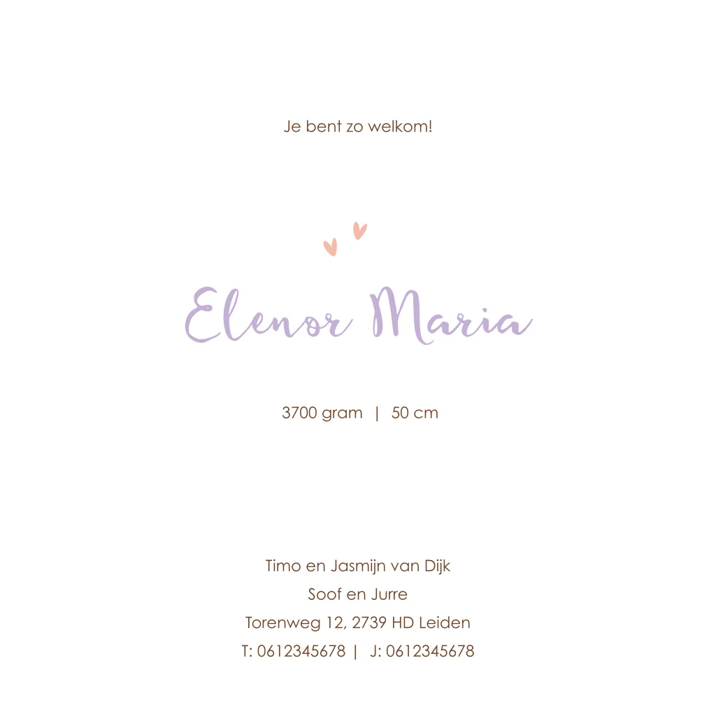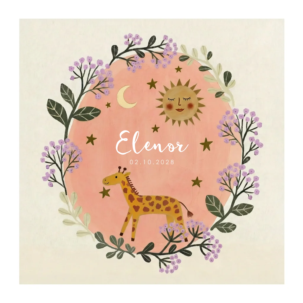 Geboortekaartje voor een meisje. In boho eclectische stijl. Met giraf, zon, maan, sterren en vrolijke bloemetjes.