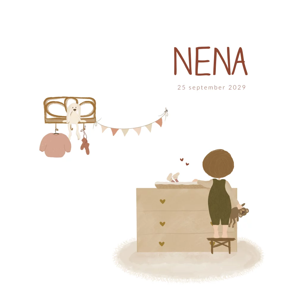 Een lief, grappig en eigenwijs geboortekaartje voor een meisje. Een kleine baby op de commode in de babykamer met Happy Horse konijn en knuffelbeer. Met een nieuwsgierige grote broer op zijn tenen kijkend bij zijn kleine zusje.