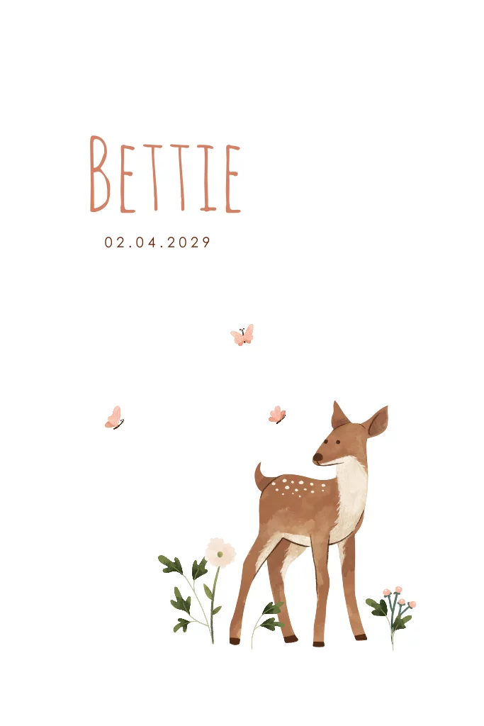 Geboortekaartje voor een meisje. Met een lief hertje kijkend naar de vlinders. En mooi geboortekaartje voor de lente en zomer kindjes.