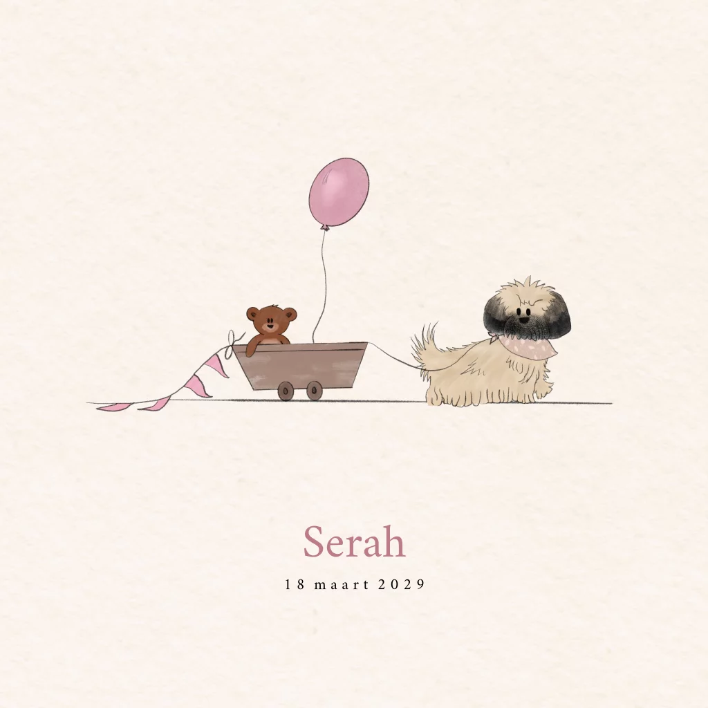 Geboortekaartje meisje hond bolderkar knuffelbeer ballon