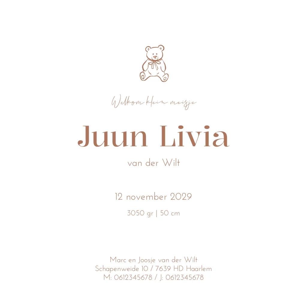 - Marloes“Ruime keuze uit geboortekaartjes die passen bij het seizoen, heel fijn dat je ze zelf kan aanpassen naar smaak. We hadden alles klaar staan en hoefde alleen nog geboorteinfo aan te passen. Daardoor waren de kaartjes al op dag 3 na de geboorte in huis! Superfijn.”