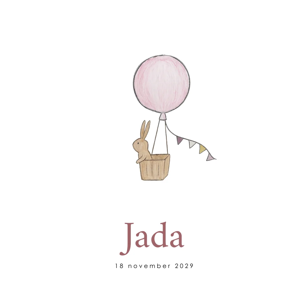 Geboortekaartje voor een meisje. Met een lieve illustratie van een konijntje in een luchtballon.