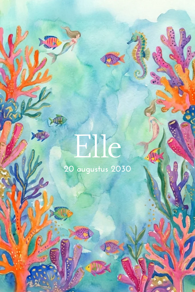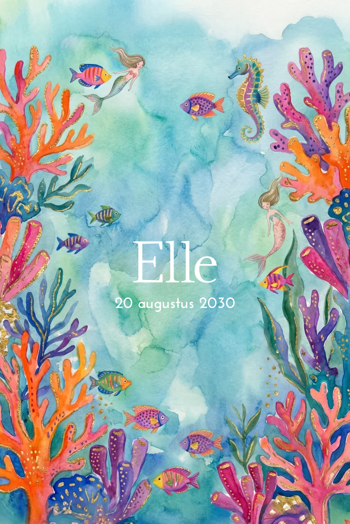 Kleurrijk en uniek geboortekaartje voor een meisje. Vol met gekleurd koraal, visjes en zeemeerminnen. De naam op de voorzijde staat in goudfolie.