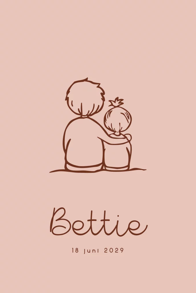 Geboortekaartje voor een meisje met een lijntekening van een grote broer met zijn kleine zusje.