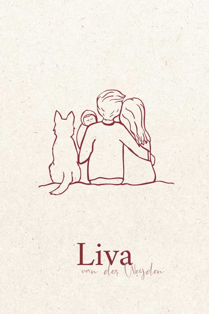 Geboortekaartje voor een meisje. Met een lijntekening van papa, mama, baby en herdershond.