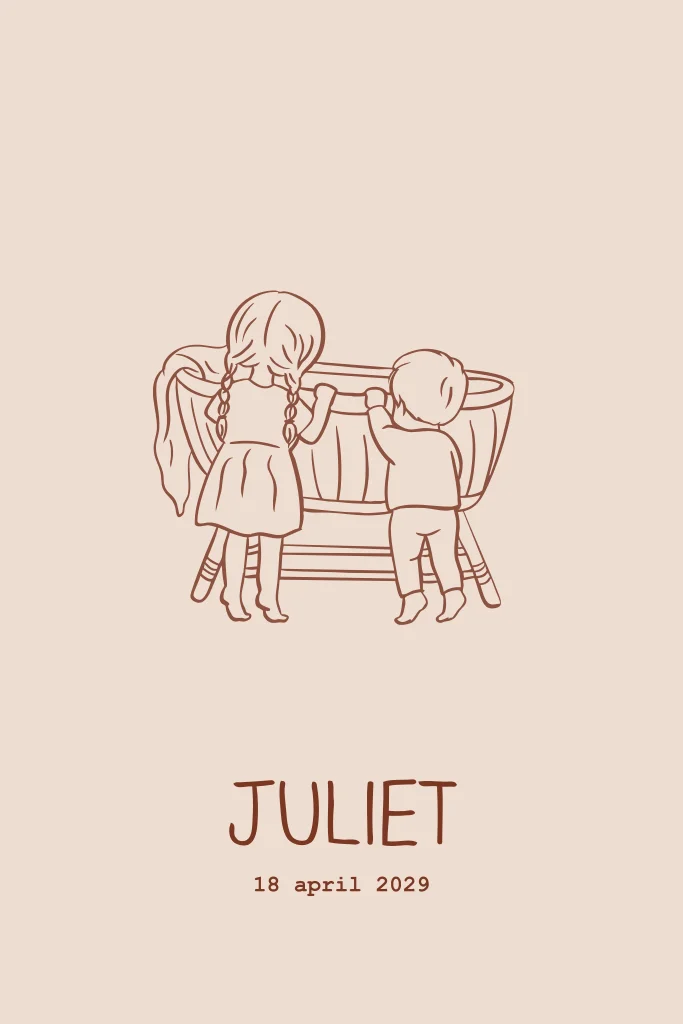 Een lief en schattig geboortekaartje met een voor een meisje en tegelijk klein zusje. Met een lijntekening van grote zus en broer die over de rand van de wieg kijken.