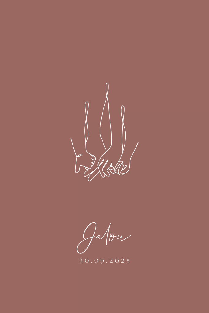 Geboortekaartje met een lijntekening van een vasthoudende familie van vier. De naam op de voorzijde is in goudfolie.