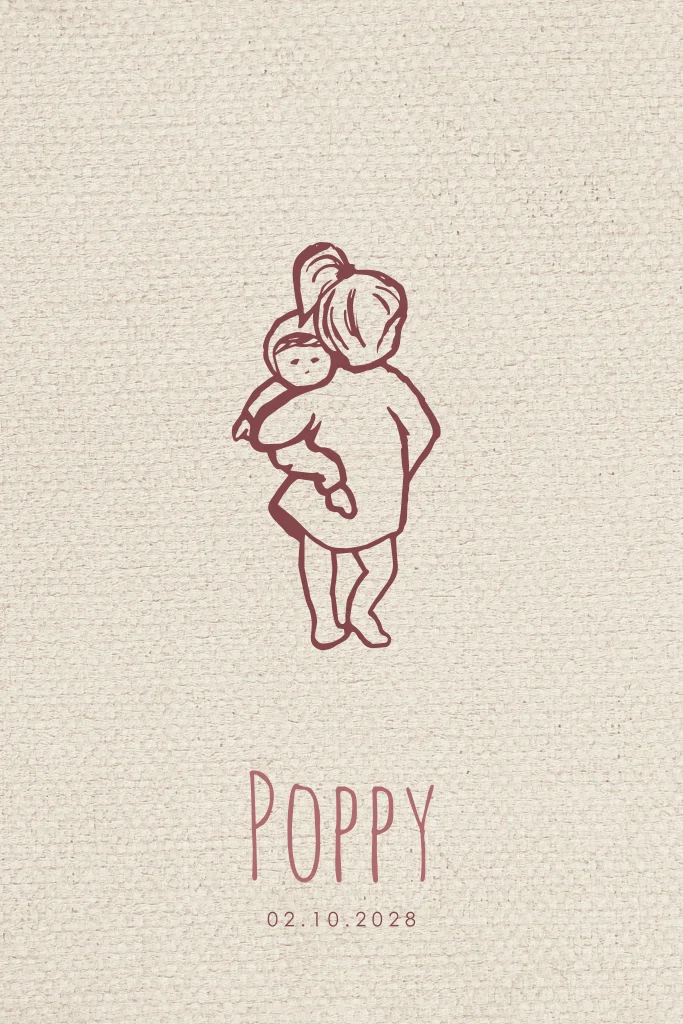 Geboortekaartje met een lijntekening van een grote zus met een baby zusje in haar armen. Welkom lief zusje!