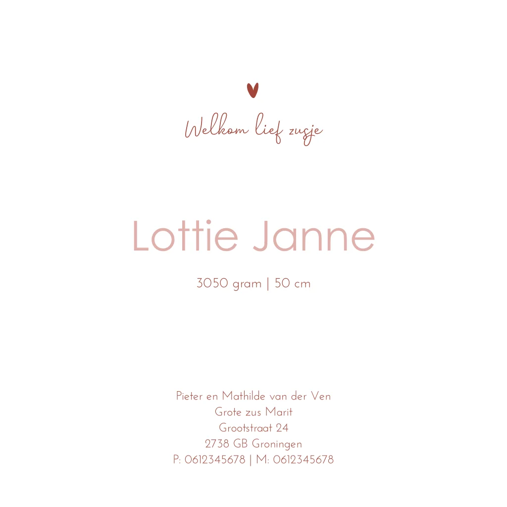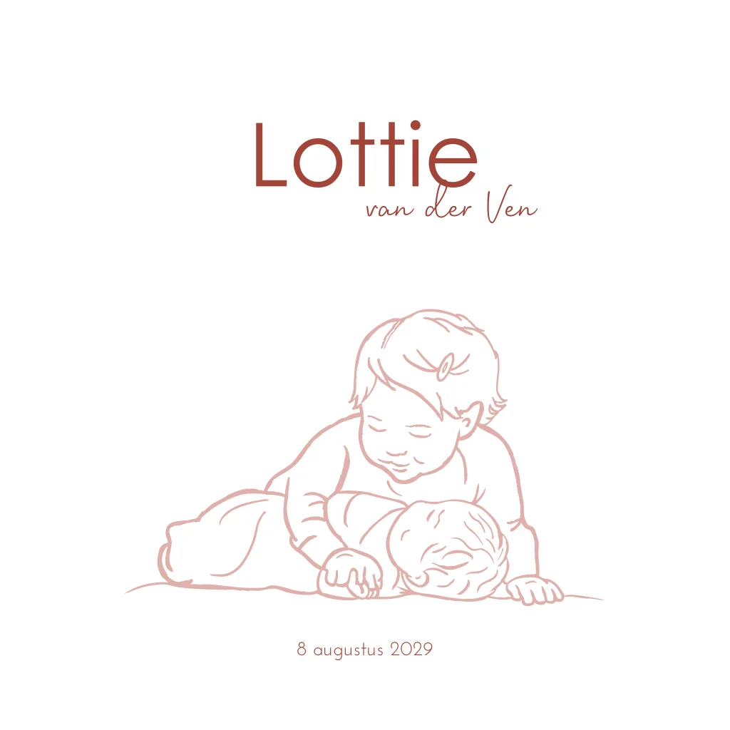 Lief en klassiek geboortekaartje voor een meisje. Met een lijntekening van een grote zus die liggend bij haar baby zusje aan het kijken is.