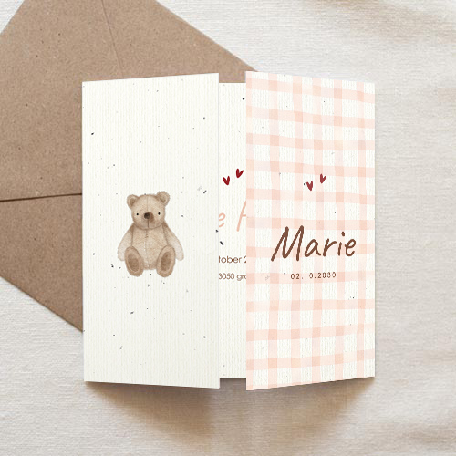 Lief geboortekaartje voor een meisje met roze ruitjes en een lieve knuffelbeer. Het kaartje heeft een tweeluik waardoor je het geboortekaartje op een originele manier openklapt.