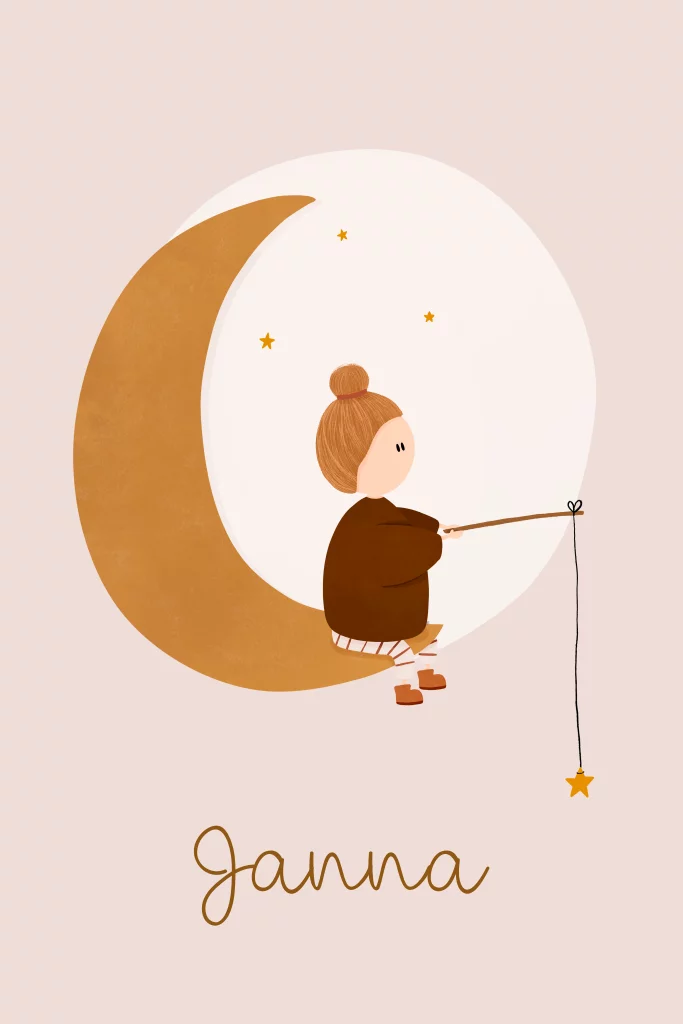 Grappig geboortekaartje met een klein meisje op de maan en sterretjes aan het vangen met een hengel. Super eigenwijs, schattig en grappig tegelijk!