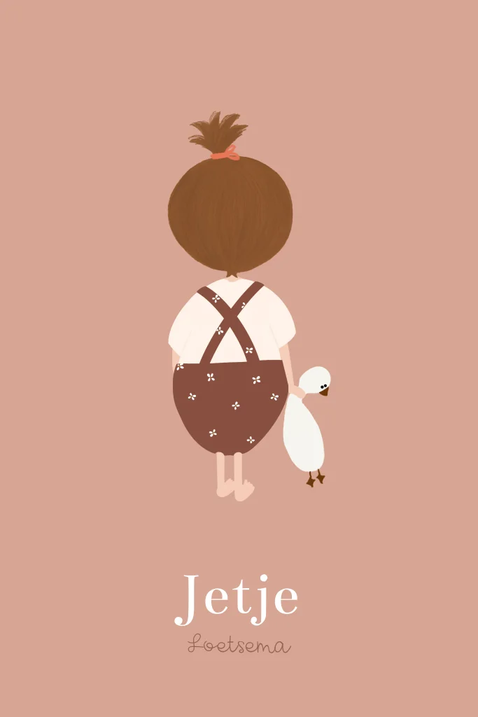 Een vrolijk geboortekaartje met een klein meisje met een knuffelgans in haar hand. Pas het kapsel en de kleertjes zelf aan. Je vindt alle elementen bij de afbeeldingen onder Kindjes DIY. Hulp nodig? Mail ons!